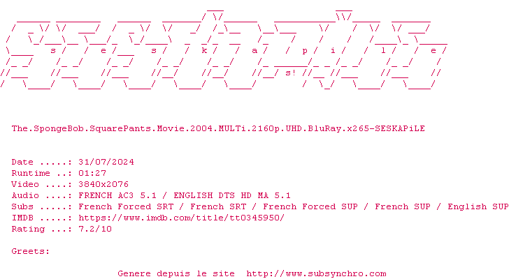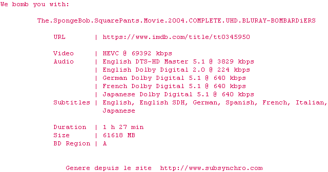 Le commentaire de Nuclear Commente par Nuclear (397), Le Samedi 09 Mars 2013 à 11h24 Parce qu'il chahute les traditions du dessin animé, "Bob l'éponge", qui ne rate d'ailleurs pas son passage au long métrage, mérite le coup d'œil. 6 / 10 0 0