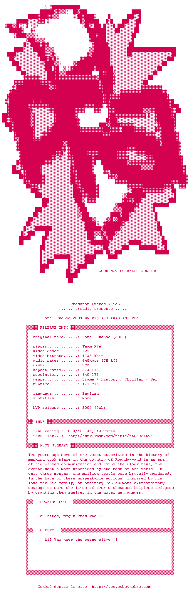 Voir le nfo de la release Hotel.Rwanda.2004.DVDRip.AC3.XviD.iNT-PFa