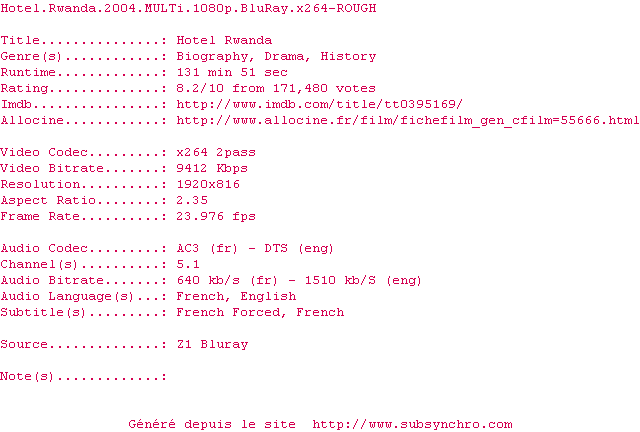 Voir le nfo de la release Hotel.Rwanda.2004.MULTi.1080p.BluRay.x264-ROUGH