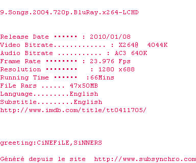 | Voir le nfo de la release 9.Songs.2004.720p.BluRay.x264-LCHD | LCHD | 9.Songs.2004.720p.BluRay.x264-LCHD OpenSubtitles | 22/07/2013 | Disponible en Z2, FANSUB | 2 fichiers |