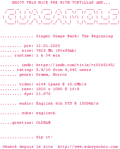 Voir le nfo de la release Ginger.Snaps.Back.The.Beginning.2004.DiRFiX.1080p.BluRay.x264-GUACAMOLE
