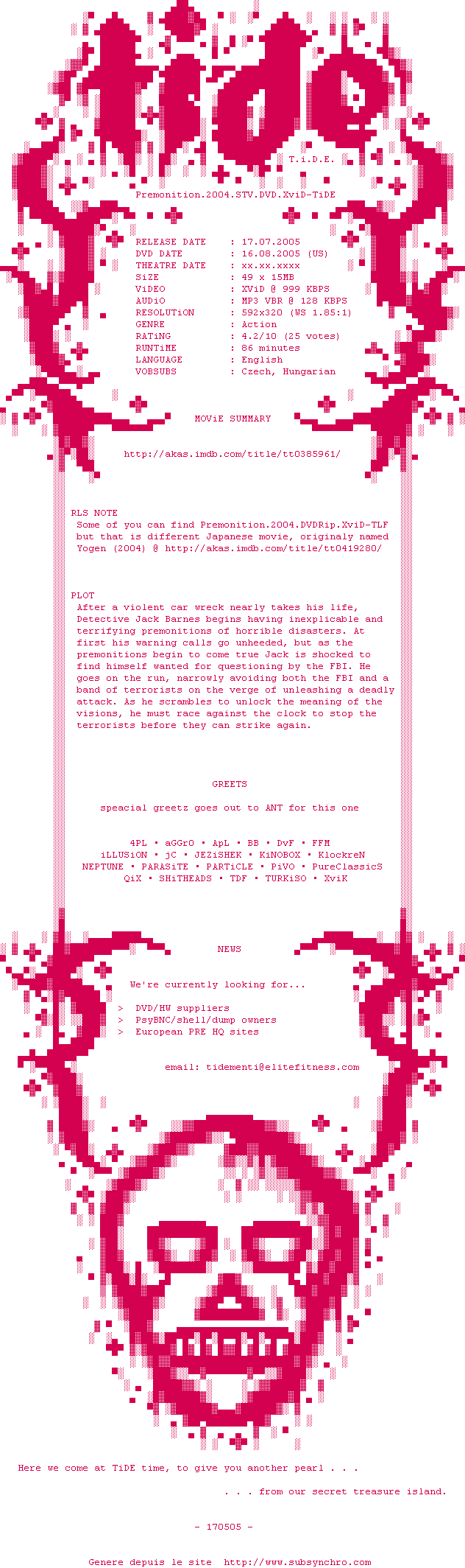 | Voir le nfo de la release Premonition.2004.STV.DVD.XviD-TiDE | TiDE | Premonition.2004.STV.DVD.XviD-TiDE OpenSubtitles | 0 fichier | ||