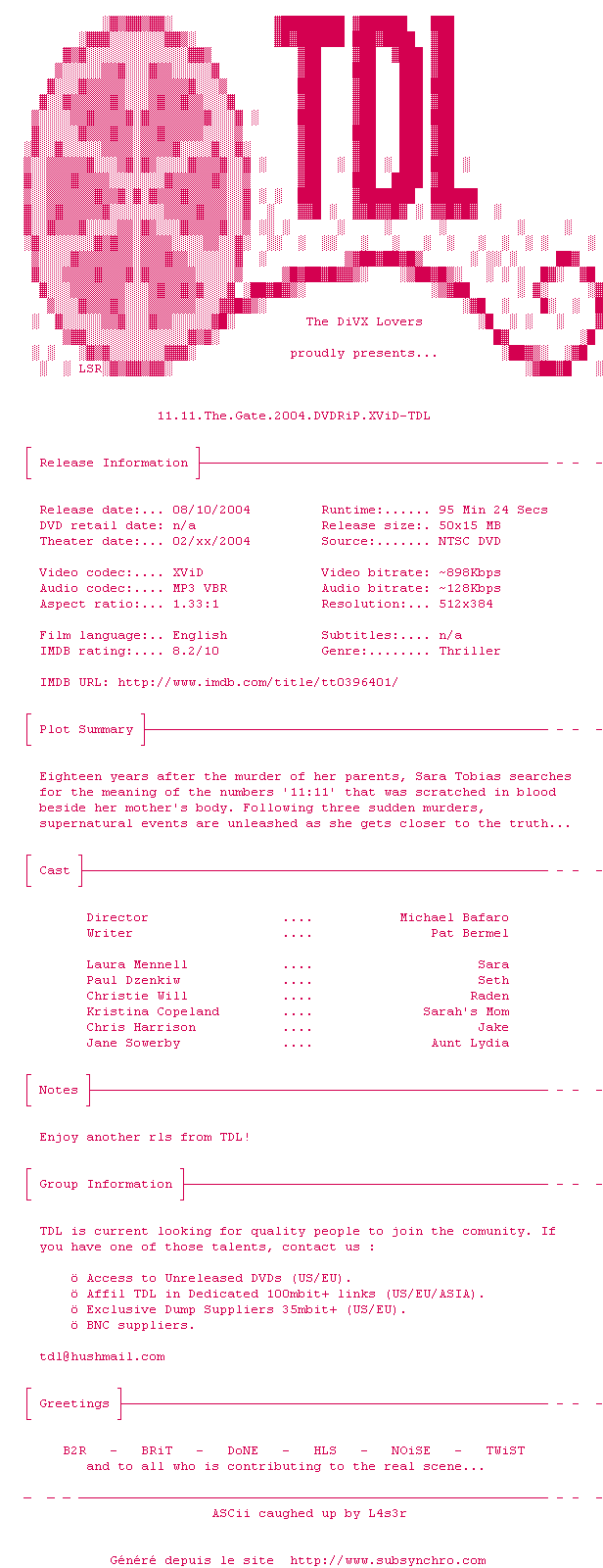 Voir le nfo de la release 11.11.The.Gate.2004.DVDRiP.XViD-TDL