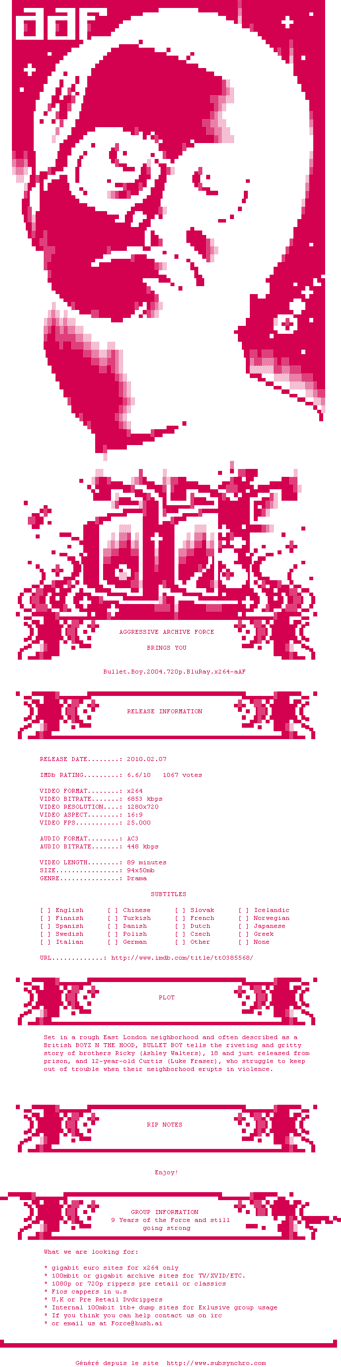 | Voir le nfo de la release Bullet.Boy.2004.720p.BluRay.x264-aAF | aAF | Bullet.Boy.2004.720p.BluRay.x264-aAF OpenSubtitles | 0 fichier | ||