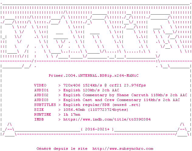Voir le nfo de la release Primer.2004.iNTERNAL.BDRip.x264-MANiC