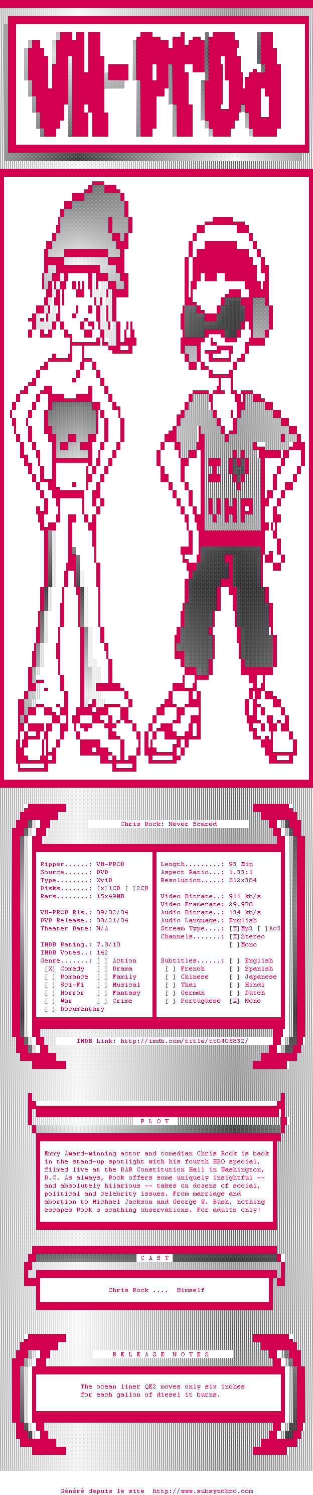 Telechargez le RSS « Fichier de la release Chris.Rock.Never.Scared.2004.DVDRip.XviD-VH-PROD »