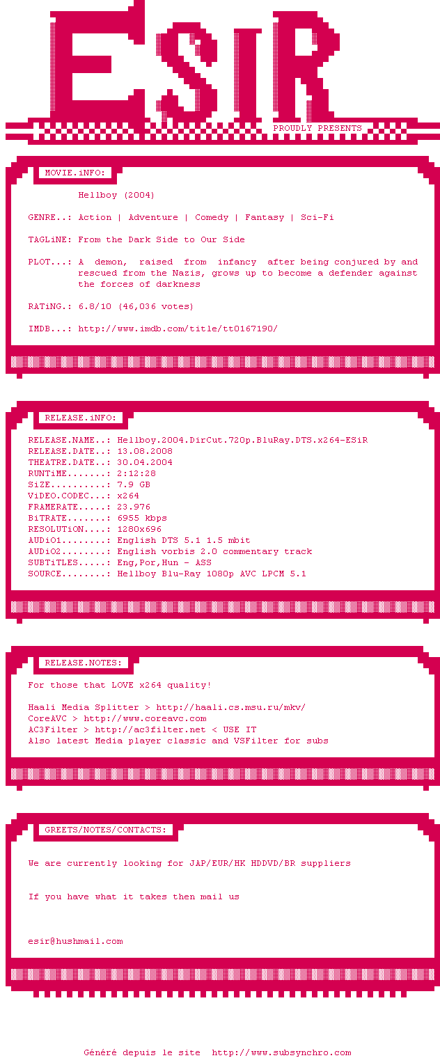 Telechargez le RSS « Fichier de la release Hellboy.2004.DirCut.720p.BluRay.DTS.x264-ESiR »
