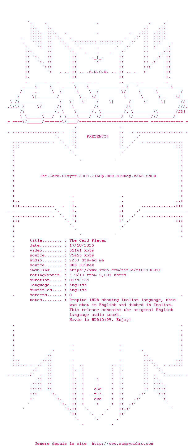 Y avez-vous pense ? Nous proposons déjà 1 sous-titre pour le film Card Player. Avez-vous essaye de voir si ces sous-titres etaient compatibles avec cette release ? On vous laisse le soin de tester cela pour nous et de contribuer au site en postant le sous-titre en cas de compatiblite constatee !