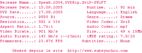Telechargez le RSS « Fichier de la release Speak.2004.DVDRip.XviD-SWiFT »