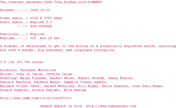Telechargez le RSS « Fichier de la release The.Constant.Gardener.2005.720p.BluRay.x264-SiNNERS »