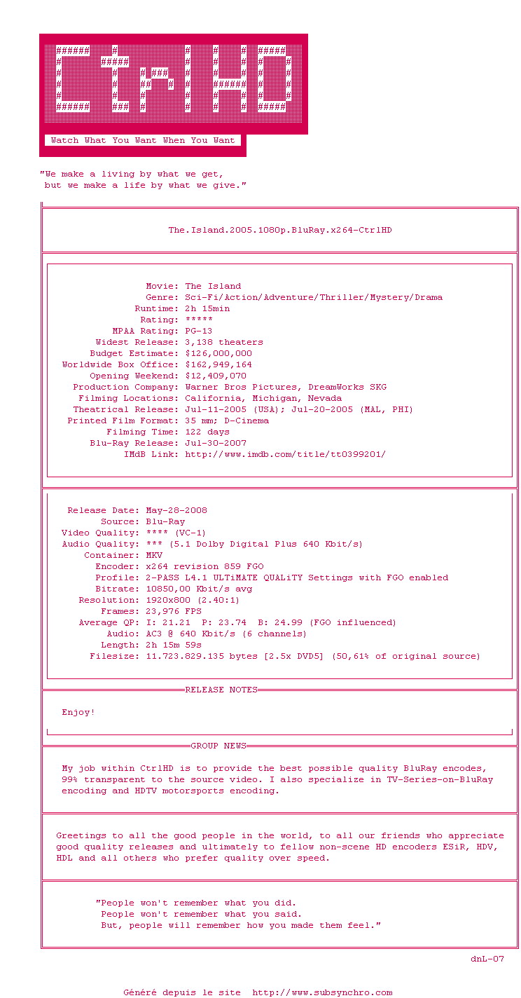 Telechargez le RSS « Fichier de la release The.Island.2005.1080p.BluRay.x264-CtrlHD »