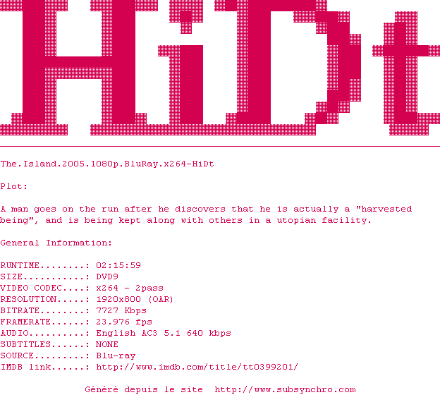 The.Island.2005.1080p.BluRay.x264-HiDt.srt Ajouté par XeiS Ajoute le 30-01-2010 03:57:48 Format : SRT Italique : Non Taille : 0.00Ko Telechargement : 139 Ajouter cette release à ma collection en cas de telechargement des sous-titres 0 0 0 Telecharger le ZiP contenant NFO, Affiche, Sous-titre (*.srt) Commentez le fichier The.Island.2005.1080p.BluRay.x264-HiDt.srt Commentez le fichier The.Island.2005.1080p.BluRay.x264-HiDt.srt Commentez ce fichier Le fichier 52-1264820268.srt n'existe pas ! Telechargez le RSS « Fichier de la release The.Island.2005.1080p.BluRay.x264-HiDt » Retour au film « The Island »