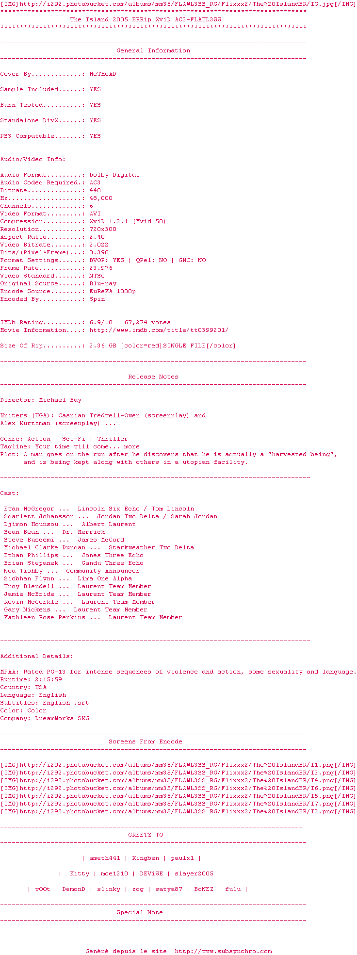 Telechargez le RSS « Fichier de la release The.Island.2005.BRRip.XviD.AC3-FLAWL3SS »