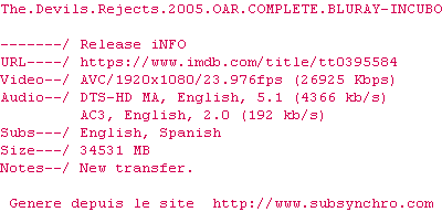 Voir le nfo de la release The.Devils.Rejects.2005.OAR.COMPLETE.BLURAY-INCUBO