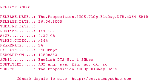Le commentaire de pahpah Commente par pahpah (22), Le Mercredi 10 Juillet 2013 à 18h51 Scénario et musique de Nick cave. Excellent film. Des maladresses mais l'ensemble est cohérent et les enjeux du film sont bien rendus. La musique hypnotique colle parfaitement avec le désert australien. 8 / 10 4 0