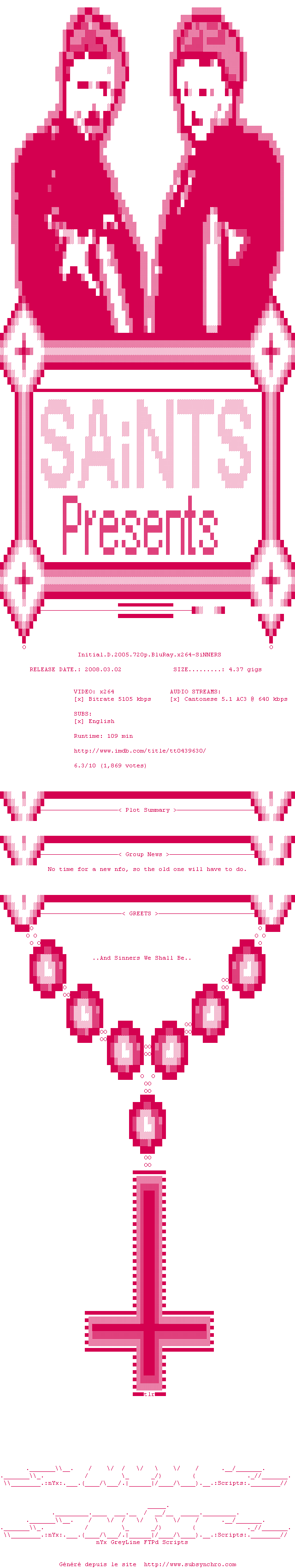 | Voir le nfo de la release Initial.D.2005.720p.BluRay.x264-SiNNERS | SiNNERS | Initial.D.2005.720p.BluRay.x264-SiNNERS OpenSubtitles | 0 fichier |