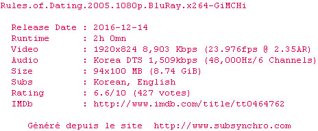 Voir le nfo de la release Rules.Of.Dating.2005.1080p.BluRay.x264-GiMCHi