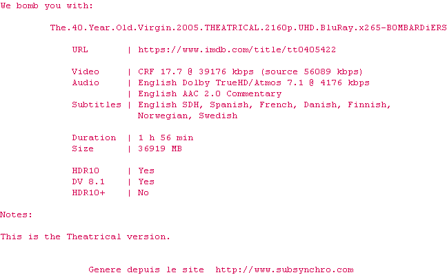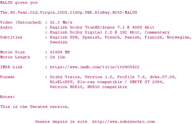 Voir le nfo de la release The.40.Year.Old.Virgin.2005.THEATRICAL.2160p.UHD.BluRay.H265-MALUS