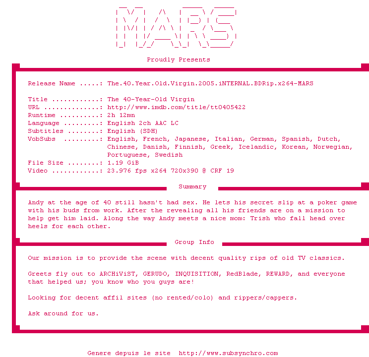 Voir le nfo de la release The.40.Year.Old.Virgin.2005.iNTERNAL.BDRip.x264-MARS