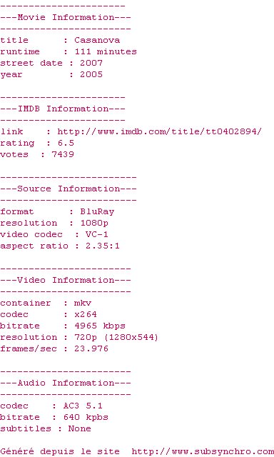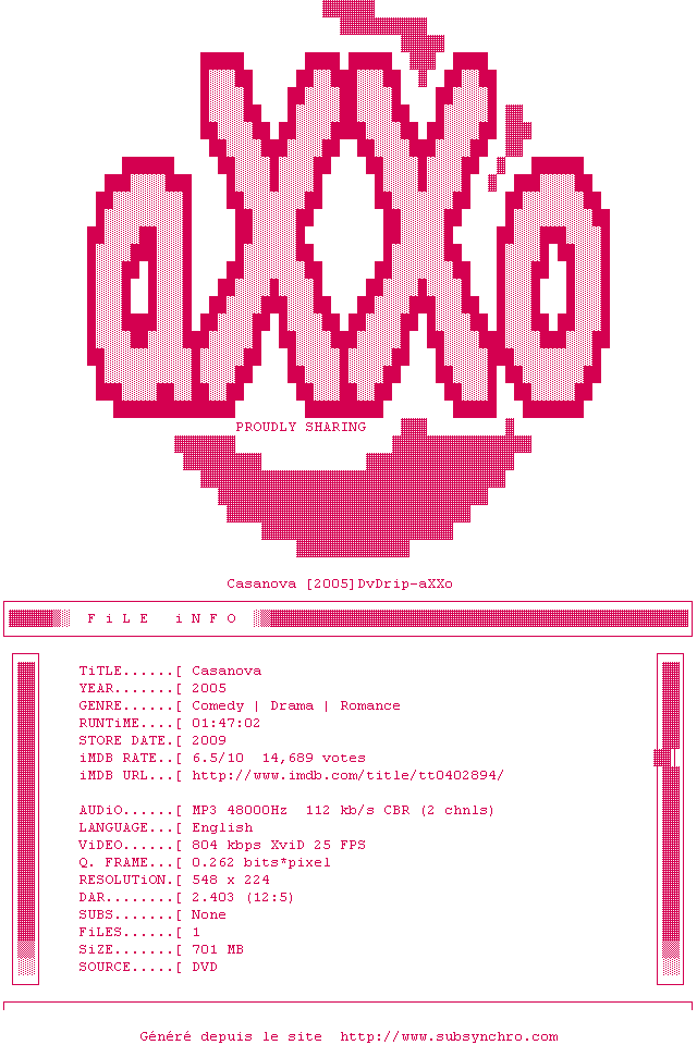| Voir le nfo de la release Casanova.2005.DvDrip-aXXo | aXXo | Casanova.2005.DvDrip-aXXo OpenSubtitles | 0 fichier | ||