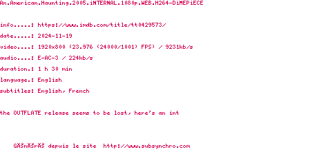 Voir le nfo de la release An.American.Haunting.2005.iNTERNAL.1080p.WEB.H264-DiMEPiECE