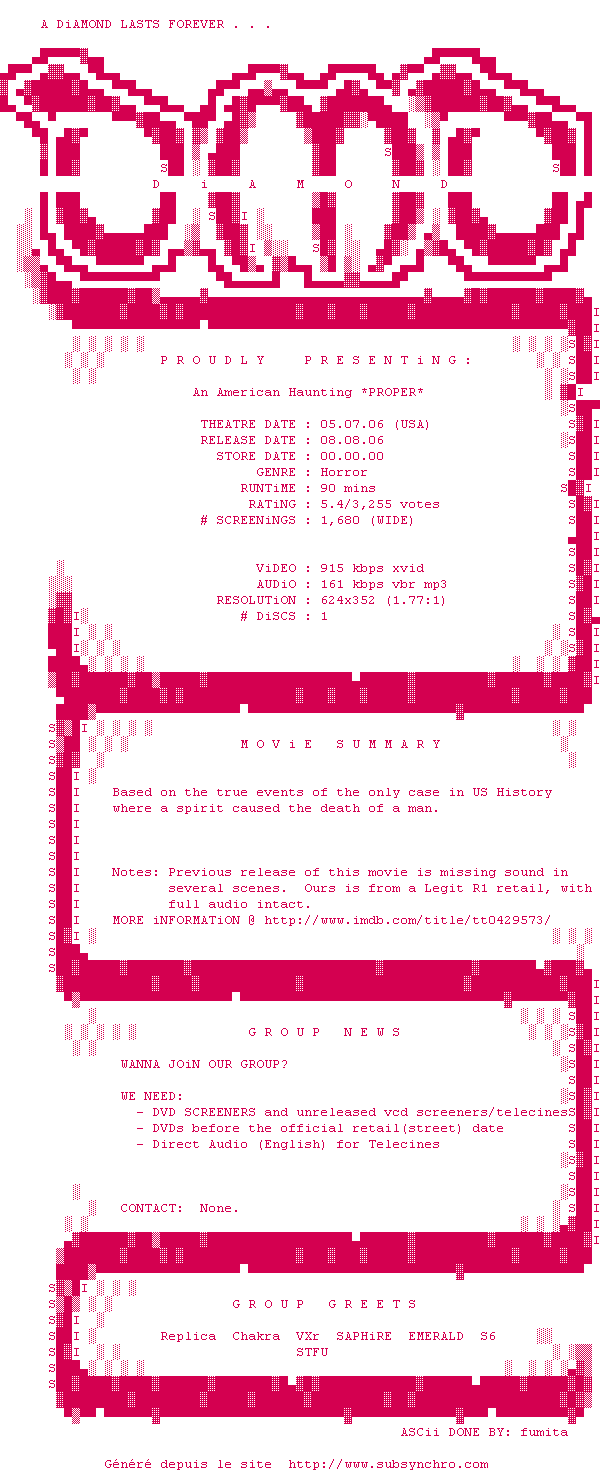 Voir le nfo de la release An.American.Haunting.2005.PROPER.DVDRip.XviD-DiAMOND