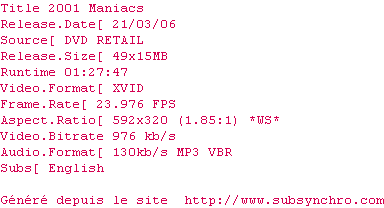 | Voir le nfo de la release 2001.Maniacs.2005.DVDRip.XviD-LPD | LPD | 2001.Maniacs.2005.DVDRip.XviD-LPD OpenSubtitles | 0 fichier | ||