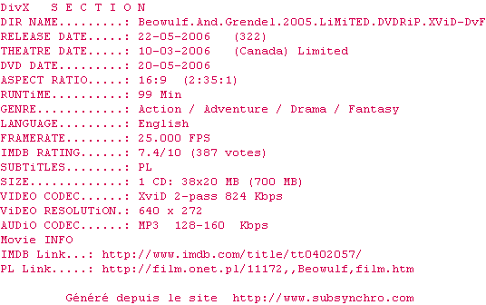Voir le nfo de la release Beowulf.And.Grendel.2005.LiMiTED.DVDRiP.XViD-DvF