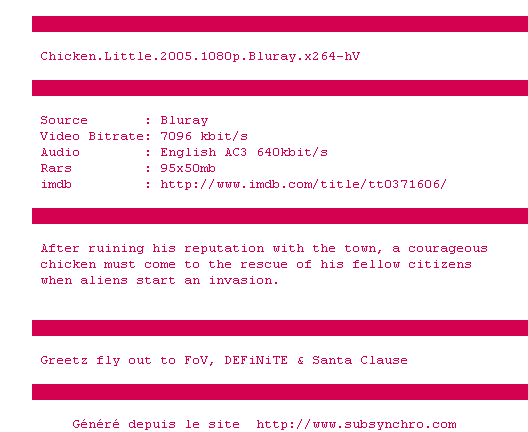 | Voir le nfo de la release Chicken.Little.2005.1080p.BluRay.x264-hV | hV | Chicken.Little.2005.1080p.BluRay.x264-hV OpenSubtitles | 0 fichier | ||