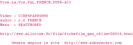 Voir le nfo de la release Vive.La.Vie.PAL.FRENCH.DVDR-AC3