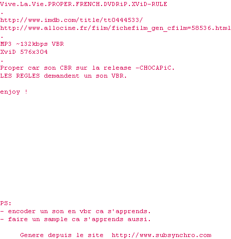 Voir le nfo de la release Vive.La.Vie.FRENCH.DVDRiP.XviD-CHOCAPiC