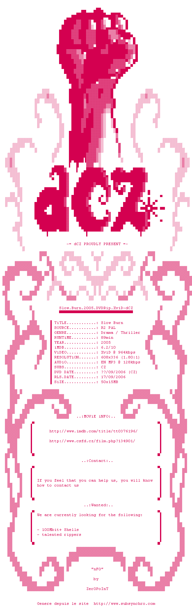 Telechargez le RSS « Fichier de la release Slow.Burn.2005.DVDRip.XviD-dCZ »