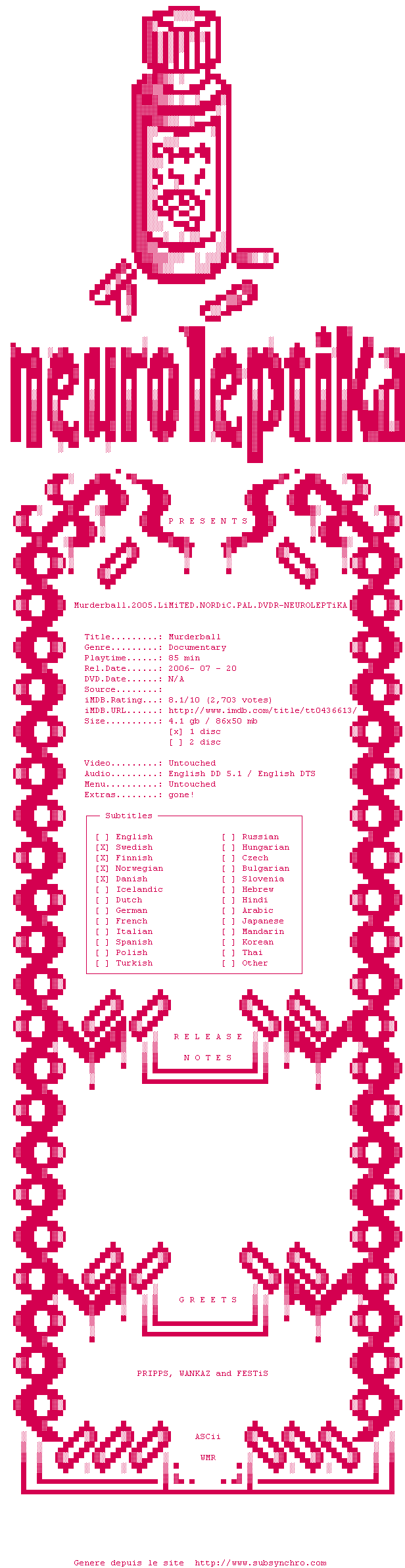Y avez-vous pense ? Nous proposons déjà 1323 sous-titres pour le film Murderball. Avez-vous essaye de voir si ces sous-titres etaient compatibles avec cette release ? On vous laisse le soin de tester cela pour nous et de contribuer au site en postant le sous-titre en cas de compatiblite constatee !