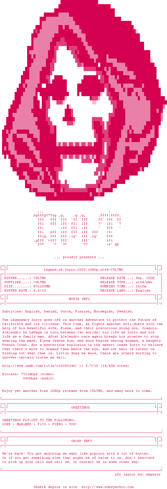 Voir le nfo de la release Legend.of.Zorro.2005.1080p.x264-CULTHD