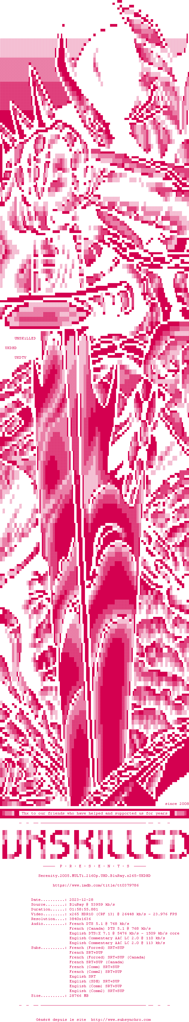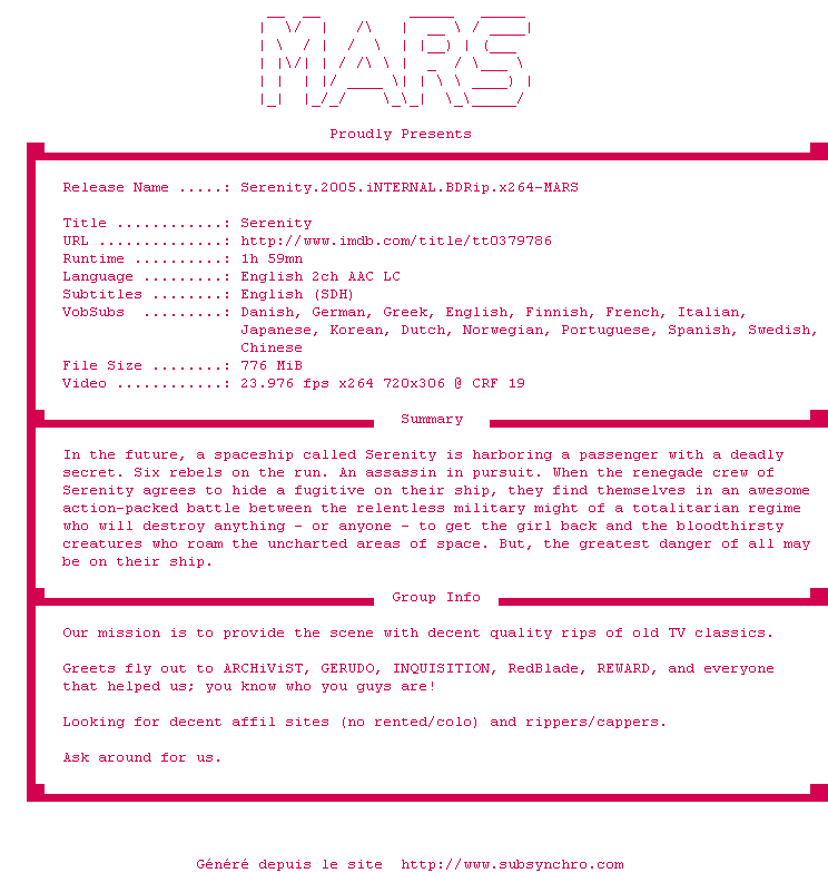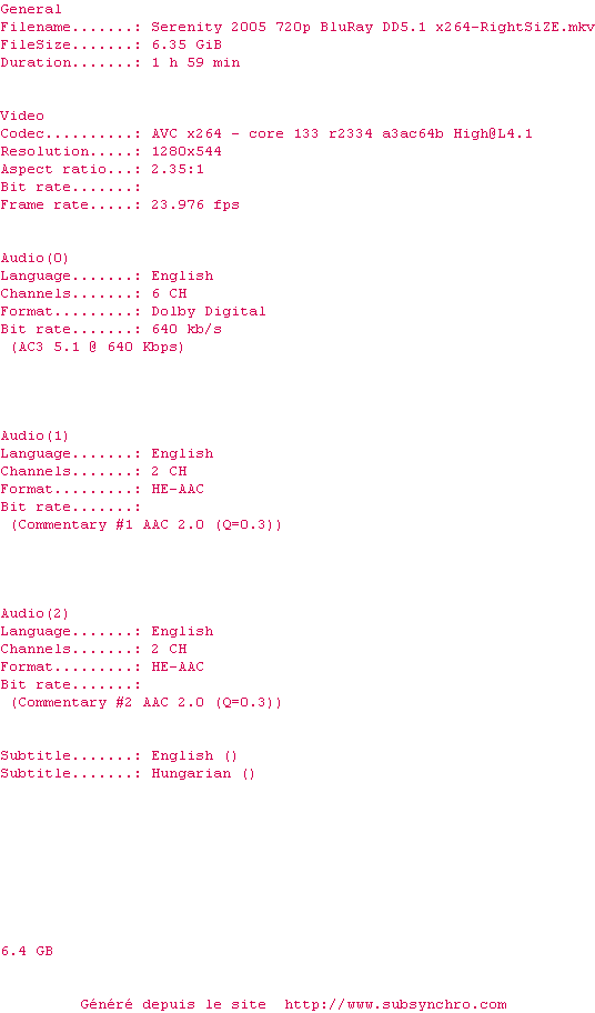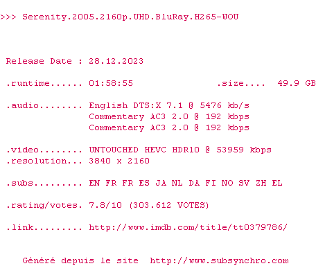 Le commentaire de wooden Commente par wooden (26), Le Mercredi 08 Janvier 2014 à 20h07 pour ceux qui aiment les histoires qui se déroulent dans des galaxies lointaines (très lointaines..) celui ci ne peut que vous plaire. Il y a beaucoup d'humanité dans ce film et le scénario rattrape certain raté. on sent un peu le coté telefilm mais a l'époque joss whedon avait peu de moyen. apres avoir vu la serie qui est exceptionnel, on retrouve avec plaisir le film qui conclue très bien cette série. 8.5 / 10 3 0