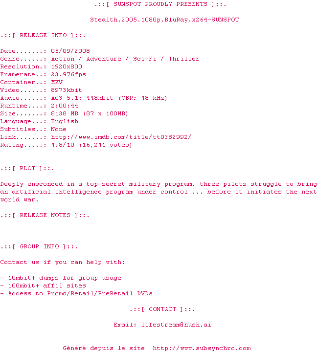 | Voir le nfo de la release Stealth.2005.1080p.BluRay.x264-SUNSPOT | SUNSPOT | Stealth.2005.1080p.BluRay.x264-SUNSPOT OpenSubtitles | 0 fichier |