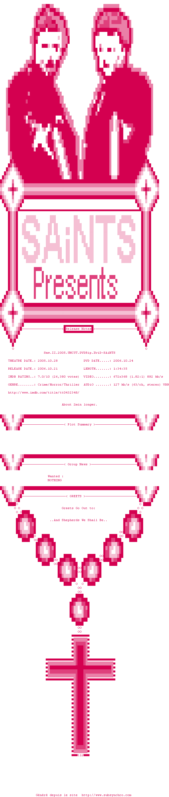 Voir le nfo de la release Saw.II.2005.UNCUT.DVDRip.XviD-SAiNTS