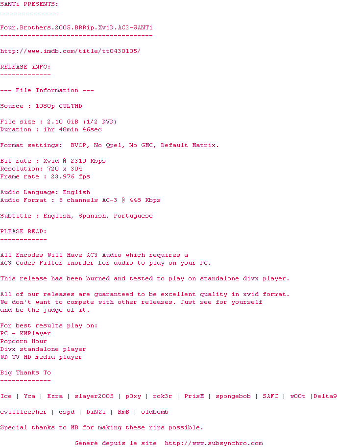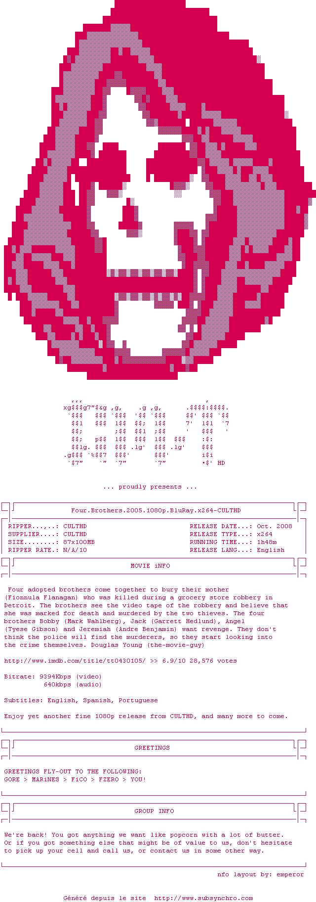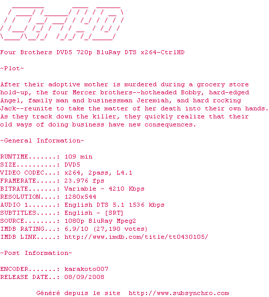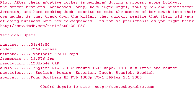 Lorsque leur "mère" est abattue par deux braqueurs de supérette, les quatre frères se retrouvent pour un dernier hommage et constatent que le temps ne les a guère changés. Bobby, la tête brûlée, n'a rien perdu de son impulsivité et de sa virulence ; Angel, le macho, s'apprête à reconquérir une belle Latino abruptement plaquée ; Jack, le benjamin, espère encore imposer ses talents de rocker. Seul Jeremiah, le plus posé de la bande, a fondé un foyer et s'est lancé dans les affaires. Il est aussi le seul des quatre frères à faire confiance au lieutenant Green pour retrouver les assassins d'Evelyn...20h