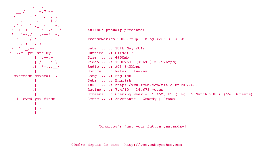 Voir le nfo de la release Transamerica.2005.720p.BluRay.X264-AMIABLE