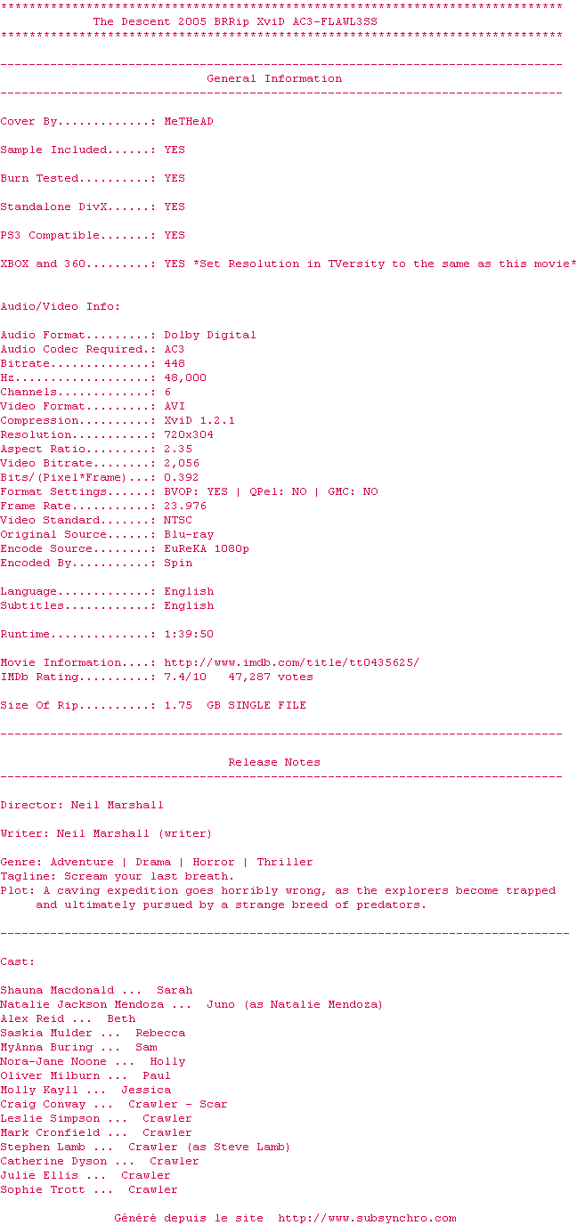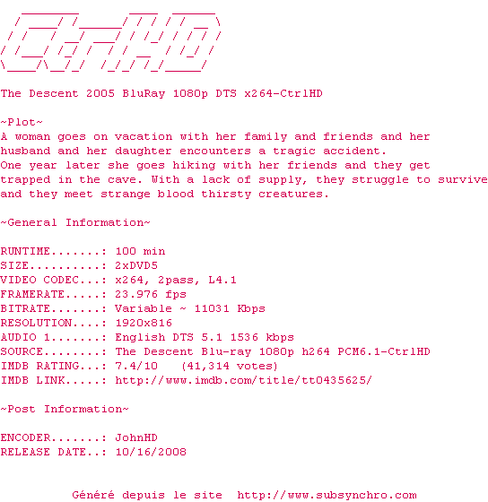 Voir le nfo de la release The.Descent.2005.BluRay.1080p.x264.DTS-HD.MA5.1.AC3.2Audios-HDWinG