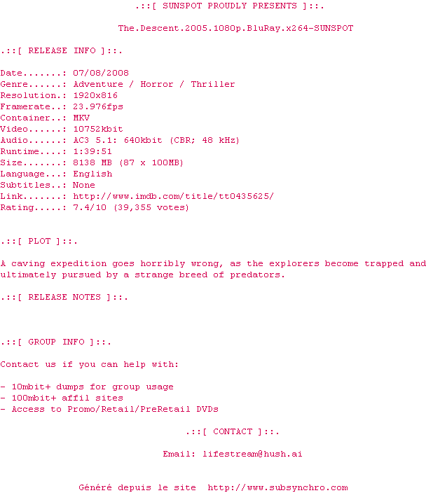 Voir le nfo de la release The.Descent.2005.1080p.BluRay.x264-SUNSPOT