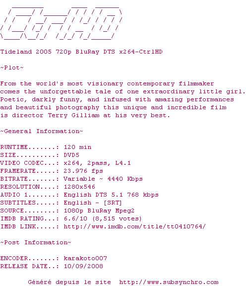 Voir le nfo de la release Tideland.2005.720p.BluRay.DTS.x264-CtrlHD