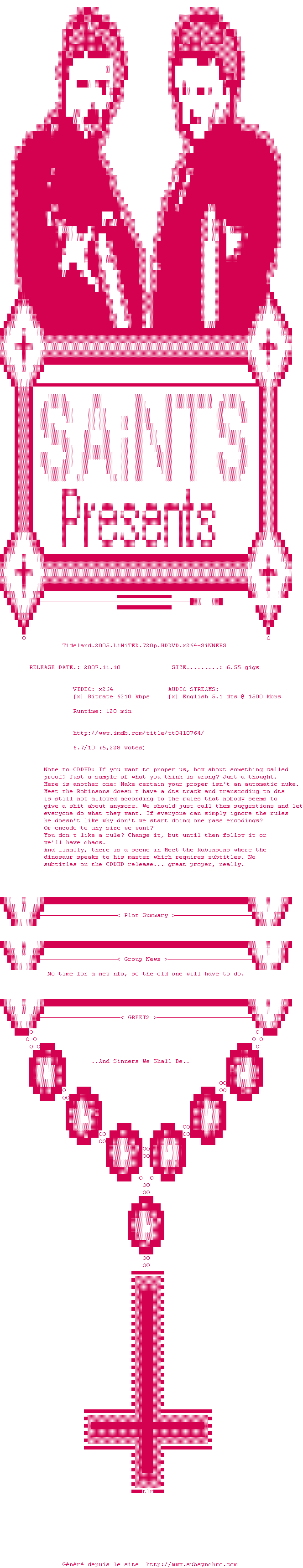 Voir le nfo de la release Tideland.2005.LiMiTED.720p.HDDVD.x264-SiNNERS