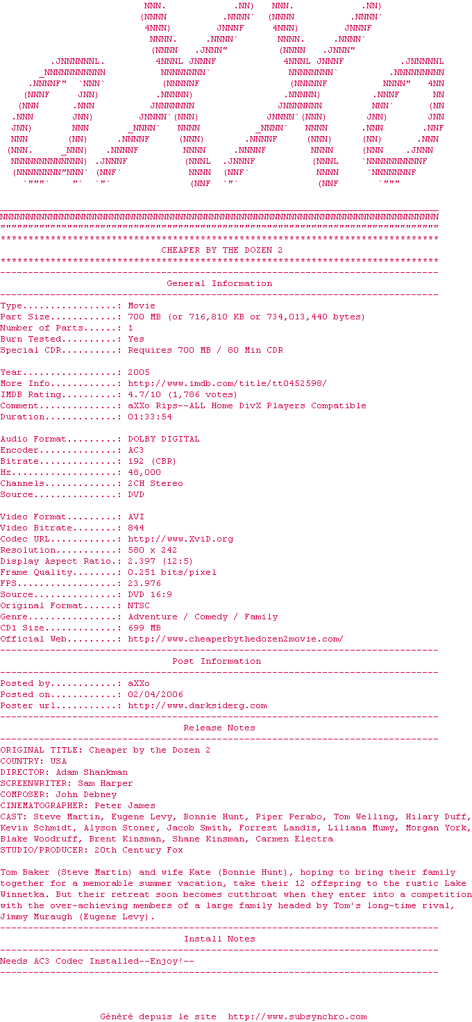 Telechargez le RSS « Fichier de la release Cheaper.By.The.Dozen.2.2005.DvDrip.AC3-aXXo »