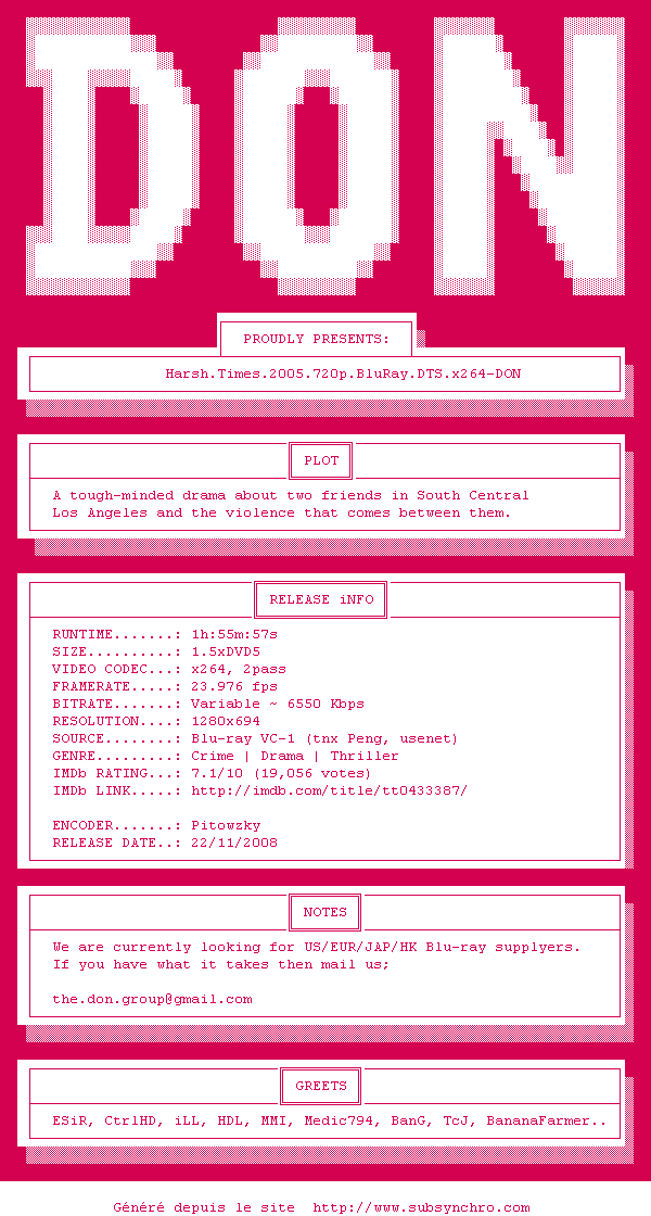Telechargez le RSS « Fichier de la release Harsh.Times.2005.720p.BluRay.DTS.x264-DON »