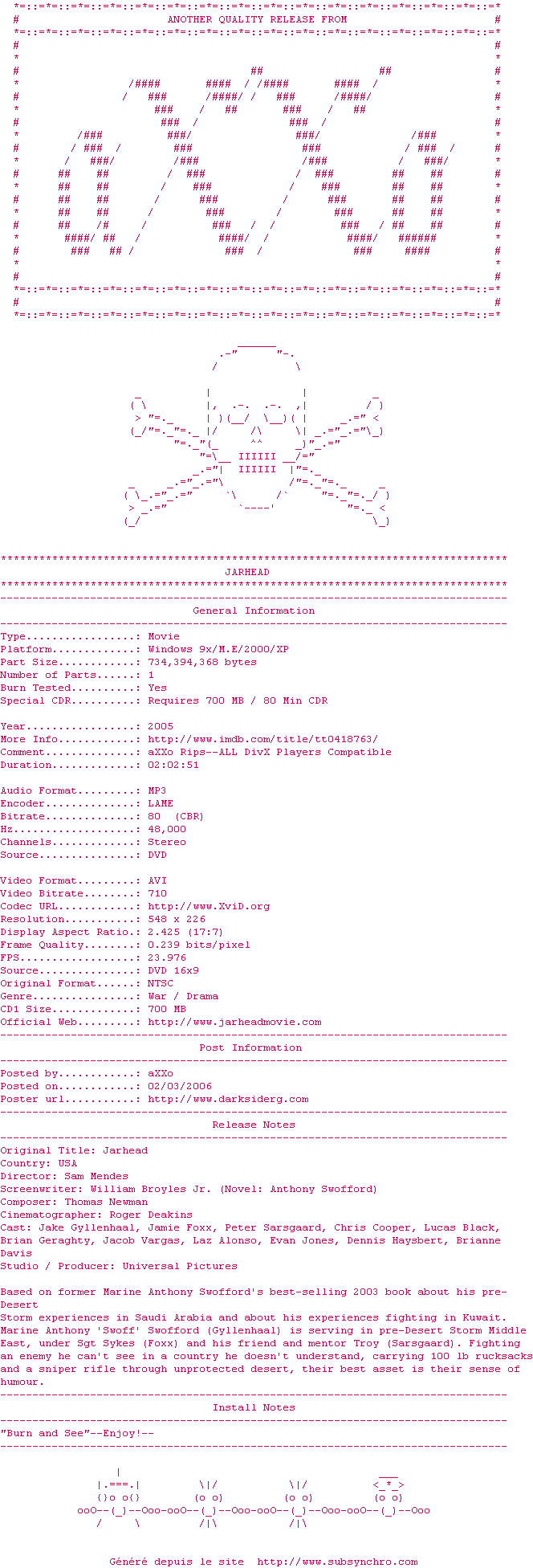 Telechargez le RSS « Fichier de la release Jarhead.2005.DvDrip.Eng-aXXo »