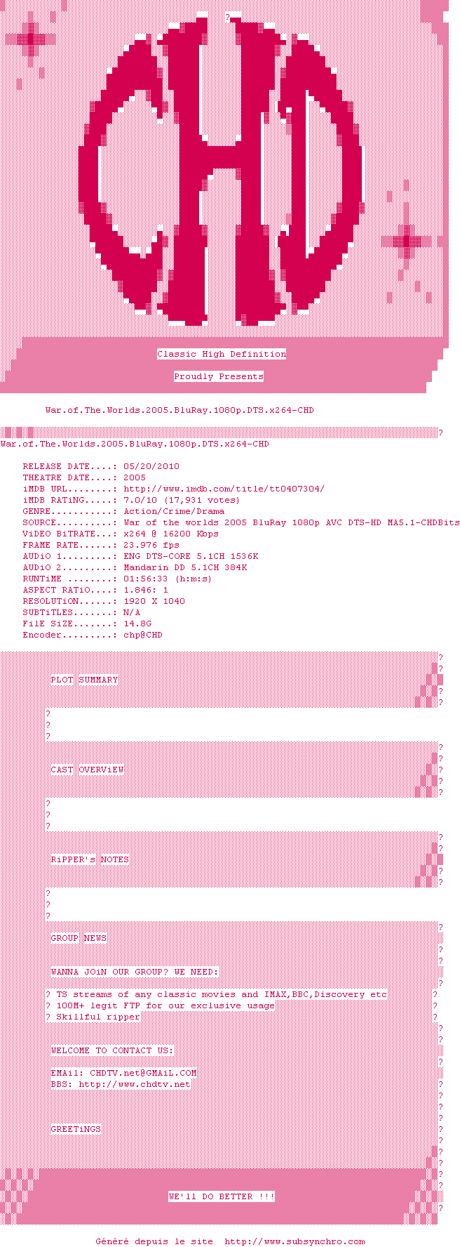 Y avez-vous pense ? Nous proposons déjà 7 sous-titres pour le film La Guerre des mondes. Avez-vous essaye de voir si ces sous-titres etaient compatibles avec cette release ? On vous laisse le soin de tester cela pour nous et de contribuer au site en postant le sous-titre en cas de compatiblite constatee !