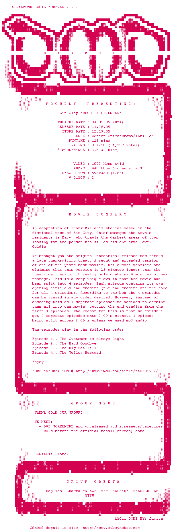 Telechargez le RSS « Fichier de la release Sin.City.RECUT.AND.EXTENDED.DVDRip.XviD-DiAMOND »