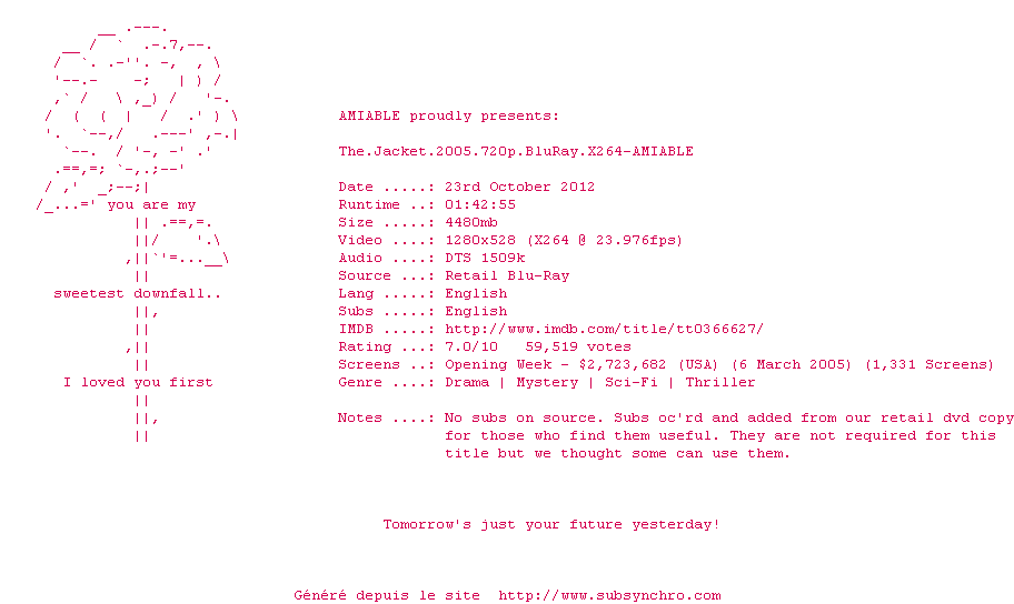 Telechargez le RSS « Fichier de la release The.Jacket.2005.720p.BluRay.X264-AMIABLE »