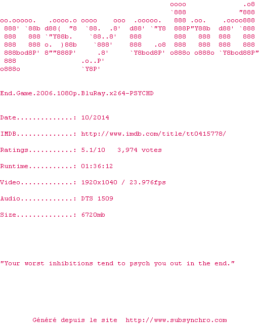 | Voir le nfo de la release End.Game.2006.1080p.BluRay.x264-PSYCHD | PSYCHD | End.Game.2006.1080p.BluRay.x264-PSYCHD OpenSubtitles | 0 fichier | ||